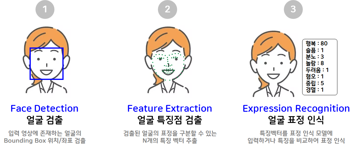 - 컴퓨터는 카메라의 시각정보를 디지털 데이터로 변환하여 이미지 분류를 통해 표정을 인식