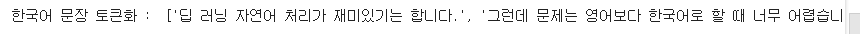 print('한국어 문장 토큰화 : ', kss.split_sentences(text))